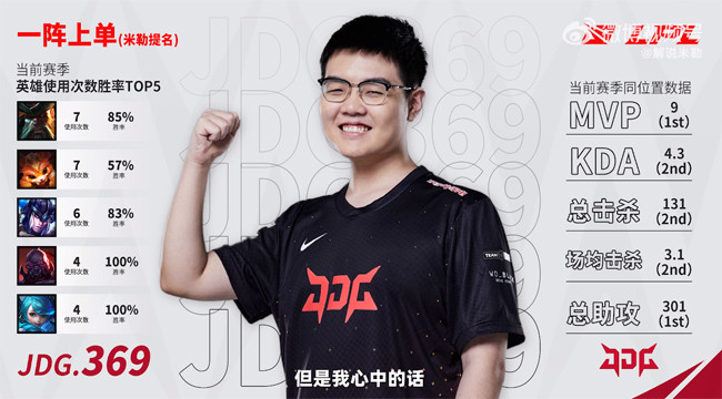 米勒在微博视频中提及上单时表示:“上单位369和TheShy的竞争会比较激烈,我更倾向于369,因为这名选手在这个赛季的成长,是我关注他职业生涯这么多年里进步最快速的一年吧。这赛季他为团队牺牲了很多,而且他变得更团队了,相较于‘青春期’的自己更会拉扯了,他也练出了像以前自己不太会使用的酒桶啊、纳尔啊,这赛季使用得还真不错,然后像赛恩、猪妹这种‘老油子’上路,也是进步得非常明显,所以我觉得369在这赛季的进步值得一阵上单。