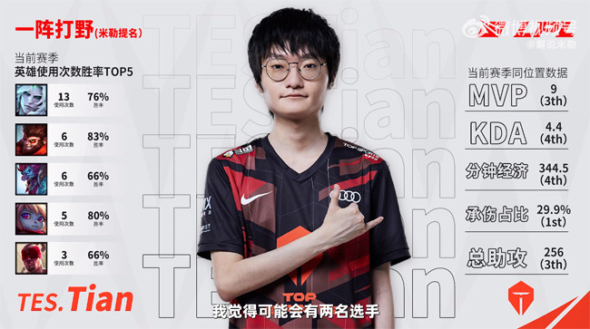 打野位Tian和Kanavi竞争可能会很激烈,我倾向于给到Tian,我觉得他相较于Kanavi的一个优势,就是会打得更加有团队性。因为有的时候Yagao啊还有其他队友可能会牺牲自己的兵线来帮助Kanavi去建立一个优势,所以可能JDG对于Kanavi的资源倾向性会更重一些。Tian厉害的点在于他能够主动单独去做一些事情,去带起一些节奏,可以看到Tian的一血参与率几乎是100%的,意味着TES前期的节奏都是由他一个人去发动,他不是说通过刷野、吃资源去carry队伍,而是通过自己的节奏带动,和中辅的联动盘活队伍。