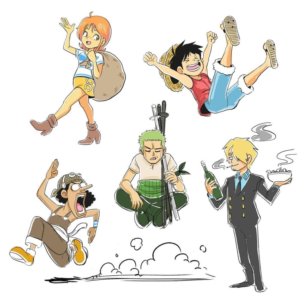 画师一组一组地将早期的人物绘制在一起,人物看起来很小巧,很可爱。 首先是早期的草帽海贼团,在东海的时候,乔巴、罗宾等人都没有加入进来,不过路飞、索隆、娜美、乌索普和山治五位船员在一起的互动也是颇为有趣的。那个时候,大家都显得很稚嫩,互相开玩笑也蛮有意思的。