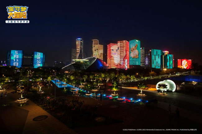 这些其实都是网易为了迎接《宝可梦大探险》公测准备的庆祝活动,除此以外,同样是杭州,《宝可梦大探险》在钱江新城也安排了一出盛大的灯光秀,各个宝可梦激萌亮相,承包了所有LED大屏。当天,还有LED动画展示,看皮卡丘从软萌滚圆的原版形象进化成游戏里方萌方萌的样子,这场灯光秀实在太值了!