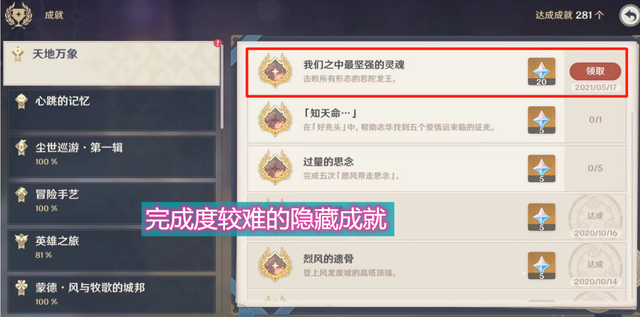 只要玩家们在四周内,按照属性顺序,将若陀龙王的所有形态都击败过一遍,就能获得这个【我们之中最坚强灵魂】的隐藏成就,光看时间跨度的话,完成起来还是比较难的,因为不知道官方在之后,还会不会按照顺序,继续排列属性,如果是的话,玩家们之前万一少打了一次,还需要多等一两个星期才能彻底弄完,不过我个人认为,两两相搭的属性,目前还没有弄全,但已经出现了这个成就,代表后续官方可能还会有新的规划,(草属性即将到来?),所以还没有获得该成就的玩家,之后要把顺序给记清楚。