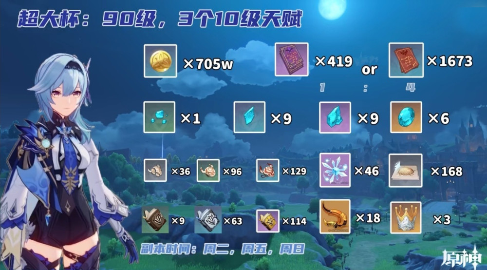 优菈的材料都比较好弄,也就是蒲公英种子、抗争的哲学比较难弄一点。还有若陀龙王的角需要很多,只有依靠异梦溶媒转换。
