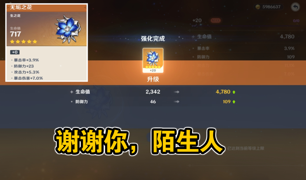 当然了也有准备失败的玩家,下面截图中的这个圣遗物是一个极品,3个最需要的属性都有,而且百分比特别高。但遗憾的是这个玩家运气并不好,全歪到了防御力上面,让我们“谢谢这个陌生人”吧。