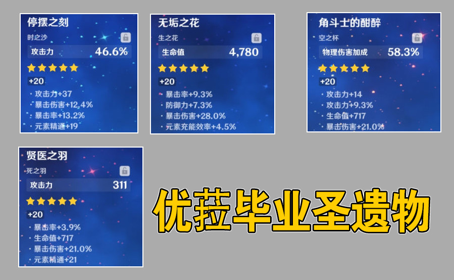 圣遗物有多难刷?想必每个玩家都清楚,没有个上千体力是出不了极品的。而新圣遗物苍白之火才出来不到一个月,就已经有人刷到了优菈的毕业圣遗物。不过帽子他没有刷到,毕竟帽子是最难刷的一个圣遗物。