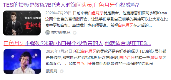 作为历经DAN、TOP、TES的队伍元老,白色月牙与队伍和队员的感情其实是极深的,他与包括369在内许多队员的关系都是一种近乎朋友的关系,临场BP也会征求场上队员的意见再行决定。但在这一年,在国产双C的光环之下,白色月牙的问题似乎开始逐渐暴露,他的平易近人也逐渐变为网友口中的“软弱”。