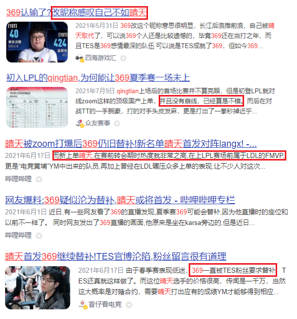 369的挣扎一方面源于信任问题:或许是由于与白色月牙的争执,TES队伍高层和粉丝们都开始不再信任369,当时网络上对qingtian这位新上单的赞誉以及对369的贬低之声简直铺天盖地,甚至连369自己都开始对自己产生怀疑。