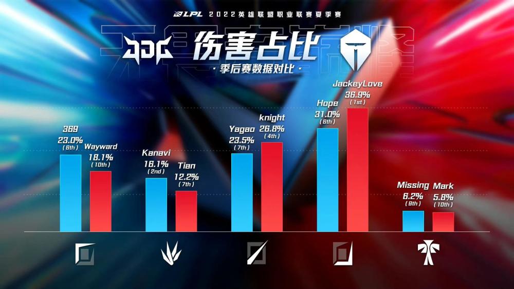 先来看整体的伤害占比,可以明显发现这个数据佐证了此前我们对于两队上野的相性分析,虽然两队的双C伤害占比都是整体中最高的,但同位置相比,TES双C要比JDG高,但上野位置JDG又要比TES高。