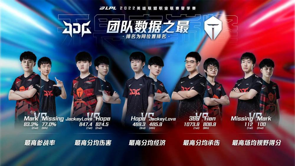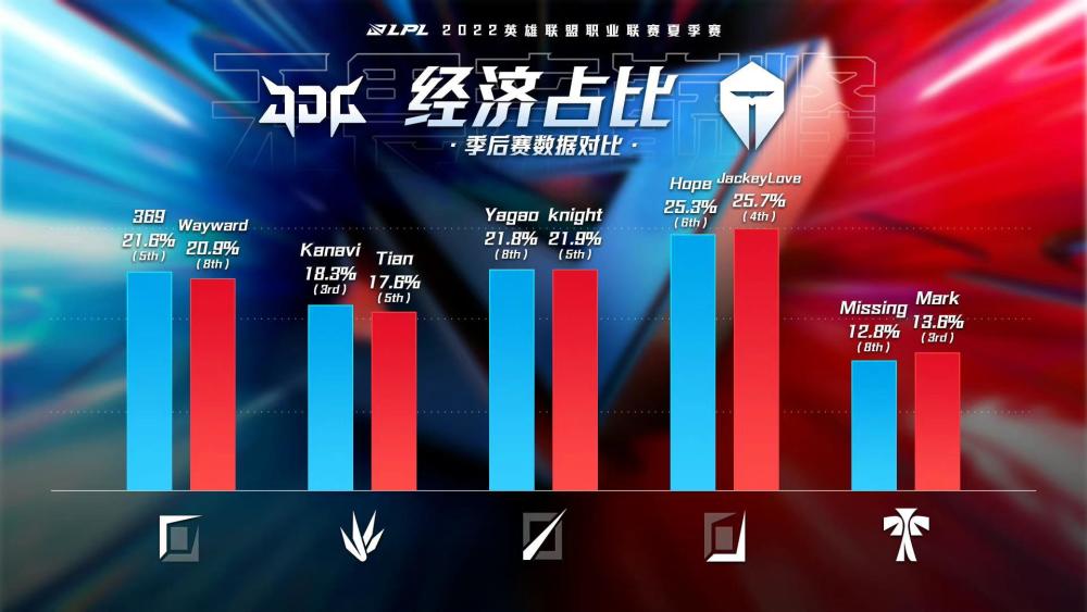 分均伤害方面,Jackeylove高于hope,这个数据后面会有详解,相信大家还记得不久前Jackeylove泽丽的那夸张的9.2万伤害,另外在经济占比上,其实两人相差不大,最后就是承伤,可以看到这两个队伍的承伤位置是不一样的,JDG是上路的369,而TES是打野位的小天,这也可以看出,上野这个位置两队的相性有点不同,JDG打野Kanavi是带有一点野核属性的,所以369有时候就需要承担一个前排,而TES这边无论是wayward还是qingtian,都是输出位,那么承伤这个重任就落到了小天身上。