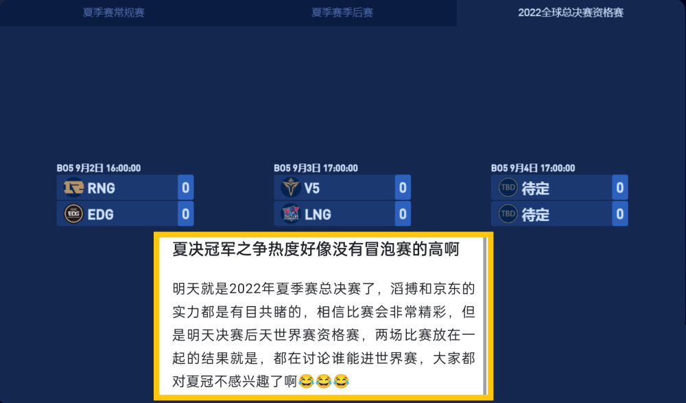 但实际上这场比赛在赛前还是引发了不少观众朋友们的质疑,我们看到在总决赛前夕,不少观众朋友们发出了这样的观点,表示这一届的LPL夏季总决赛好像热度特别的低,还有一部分观众朋友们觉得这一届的LPL夏季赛甚至没有接下来冒泡赛的关注度高,还有甚者,直接表示这将是史上热度最低的一场总决赛,当然这句话肯定是有点过分了,不过既然能够引发这么多观众朋友们觉得夏季赛总决赛的热度低,那么肯定还是有原因的。