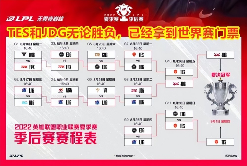 英雄联盟S12赛季,LPL夏季赛即将进入最紧张刺激的冠军争夺战,以及世界赛资格冒泡赛。而且这次的冠亚军争夺战,也非常有意思:TES和JDG两支队伍,由于他们的春夏季赛总积分,分别达到了180分140分!因此无论总决赛冠军花落谁家,TES和JDG都已经拿到了世界赛门票。
