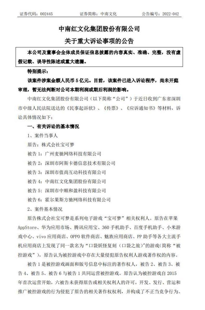 公告称,包括公司在内的6名被告被株式会社宝可梦起诉。