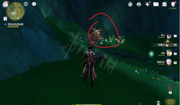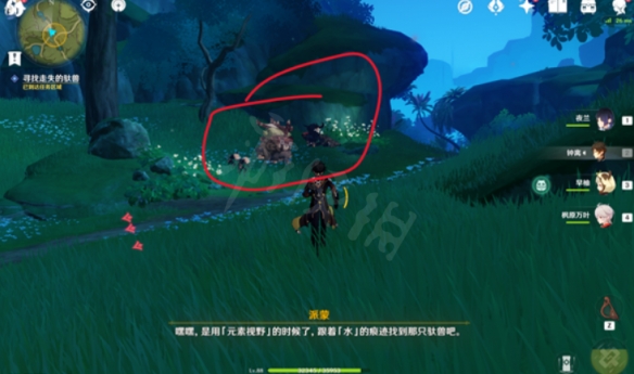 接着是第二只驮兽,位于上方任务点的。靠近后击败丘丘人解救驮兽,进入对话