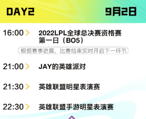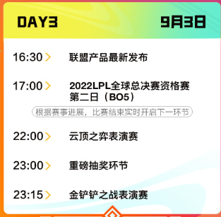 这一天比较有趣的环节是新产品发布,拳头可能会像暴雪那样向玩家们透露一下未来的游戏规划,而比赛方面相比于9月2日,9月3日的比赛要残酷很多,LNG与V5必须要有一支队伍结束今年的比赛进入假期,而胜者还需要赢下一次bo5才能确定拿到门票。比赛结束后,将进行云顶和金铲铲的表演赛。