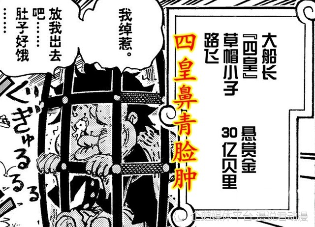 统领草帽大船团5千6百人的大船长“四皇”草帽小子路飞,正鼻青脸肿的被关押在一个狭窄的铁笼子里,十分可怜兮兮。至于原因,是路飞为了和基德较劲,不顾船员的生命安全,固执的从大瀑布一跃而下。