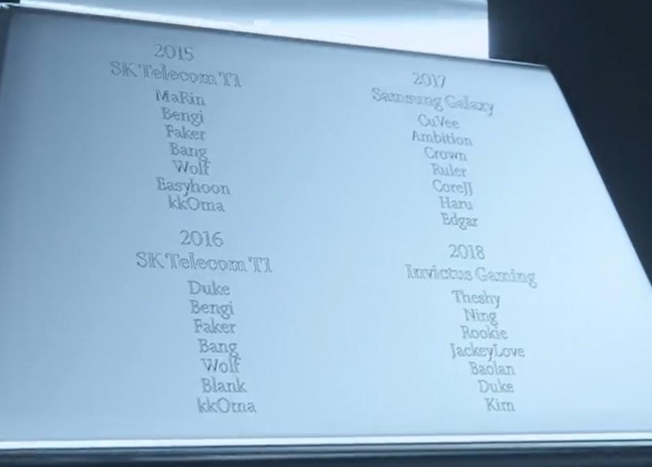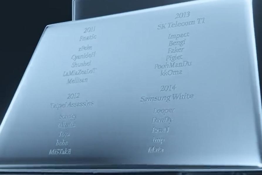 从此前官方放出的介绍视频来看,镌刻在冠军奖杯底座上的冠军选手是从2011年第一届世界赛FNC夺冠开始的,除了选手ID,还有教练以及替补选手,争议就出现这个替补选手上。