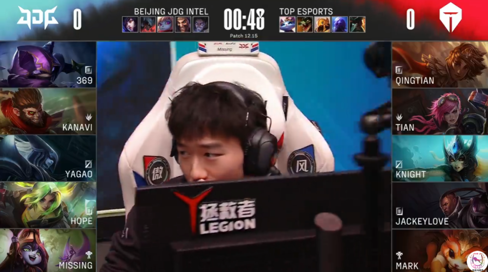 在被破两路的情况下,Tian果断中路开团369,但是由于脱节严重被369配合Kanavi反杀,随后JDG反追击再杀中单,完成一波。