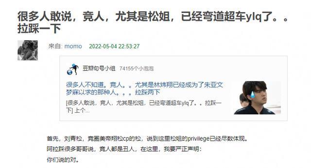 其实,这个帖子的大部分内容都是嗑cp,比如说黄轩没有cp,而刘青松有林炜翔,所以他赢了等等。除了长相这些方面,刘青松相关要点都跟林炜翔有关系,完全展露了踩组嗑cp的实力。看到这种帖子,刘青松应该很无语,难怪他说自己不敢点开。