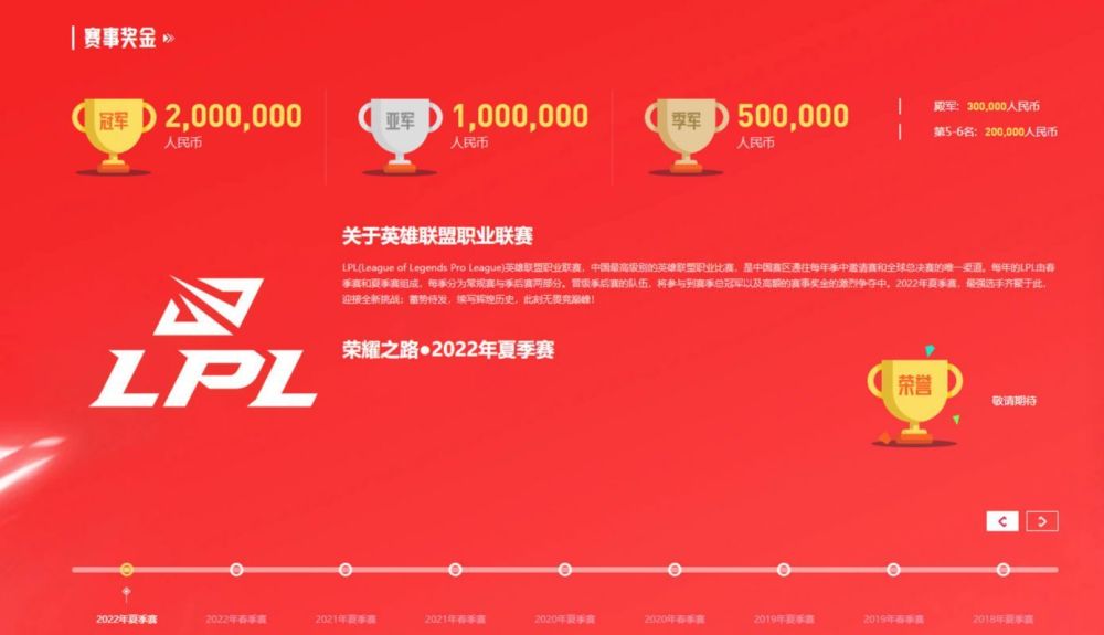 这场决赛除了是TES和JDG第三次在LPL决赛中交手以外,同时也是双方队伍争夺队史第二座LPL冠军奖杯的时刻,而在2022LPL夏季赛总决赛开赛之前,本次的赛事奖金池也正式的公布了,其中夏季赛冠军队伍会得到200万的人民币奖金、亚军是100万奖金、季军则是50万奖金、殿军30万奖金,季后赛的第五名和第六名都是20万奖金。