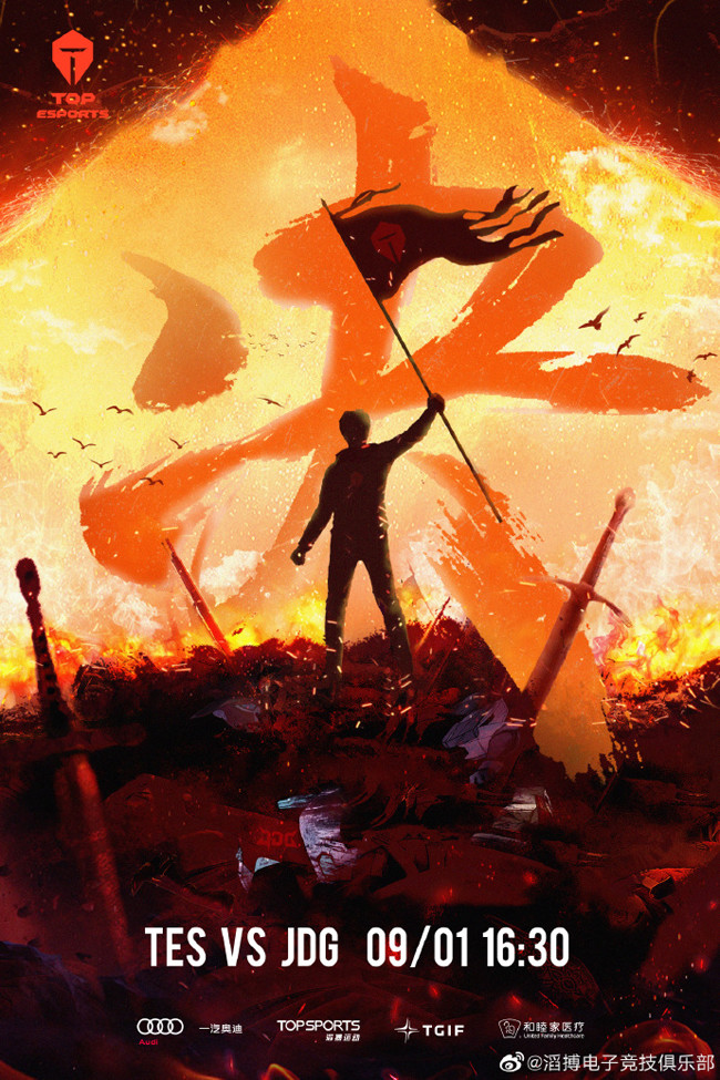 TES的海报标题为“决”,两军对垒过后的战场一片狼藉,在残盔破甲之间能看到JDG的队旗,而最终的胜者TES高高地举起了大旗,背后的烈焰也宣告着经历淬炼的王者强势凯旋!今天TES的首发上单是小将Qingtian,在Wayward被连爆五局后,Qingtian临危受命挑战369,剑魔或将成为双方针对上路的BP重点。今晚究竟是Qingtian顶住压力带队夺冠,还是69哥再度打穿上路拿到LPL一号种子?让我们拭目以待!