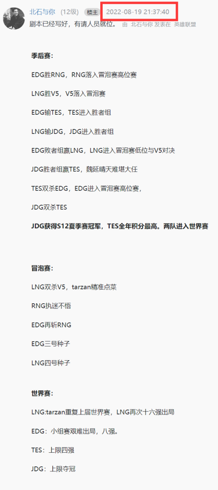 LPL赛区今年最后一场BO5就是左手NG互搏,LNG在掷硬币中胜出具有优先选边权,两队将争夺最后一张世界赛门票,胜者以四号种子身份从S12世界赛入围赛打起。此前有一位预言帝精准预测了季后赛六强开始的所有比赛,他最后一个预测是LNG拿到4号种子,他能不能达到100%预测准确率呢?