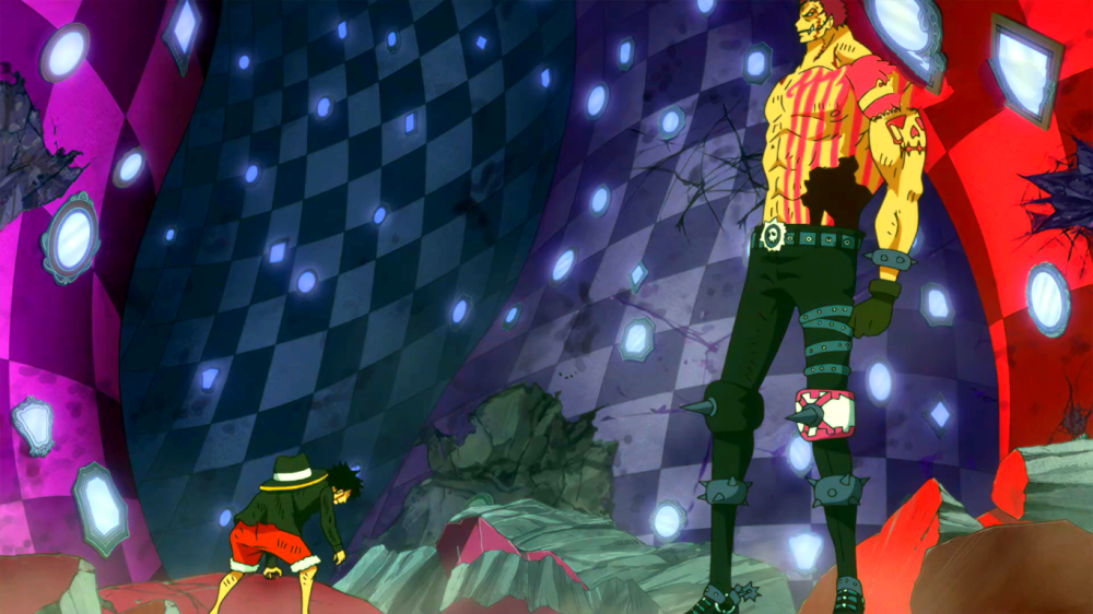 大妈篇,先是被克力架阻挡,后来是被山治暴打,然后被抓,甚平反水再次登场扰乱宴会。最终大妈被这个打不死的小强给搞得心态爆炸。随后单挑卡二也是一波三折其中还两次放水。最终路飞胜利。