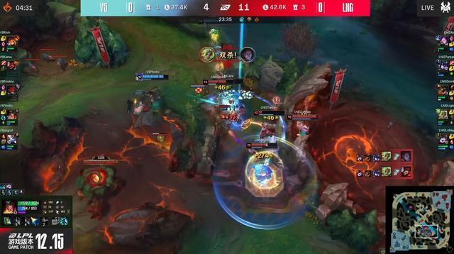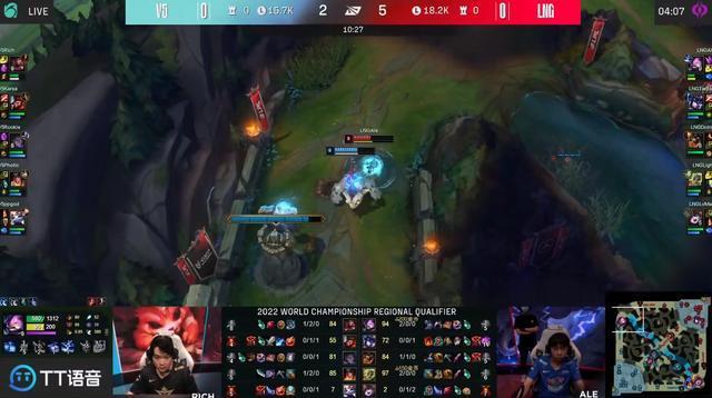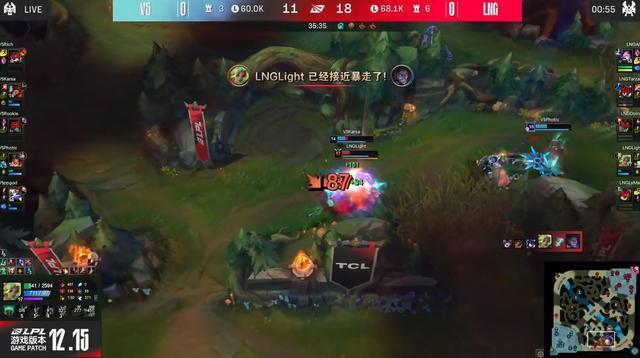 19分钟,V5出动三人想抓鳄鱼,但璐璐及时到场保下了Doinb,Ale凯南果断进场,直接电麻轮子妈并且分割了V5阵型,LNG又是取得一波0换2的完胜。