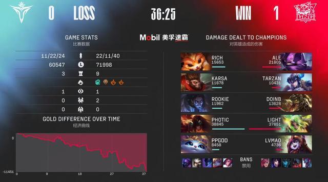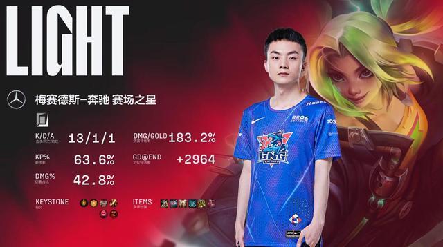 两边C位输出都拉满了,最终泽丽大后期的灵活性占据了上风,Light稳住局面帮助LNG收下第一局。