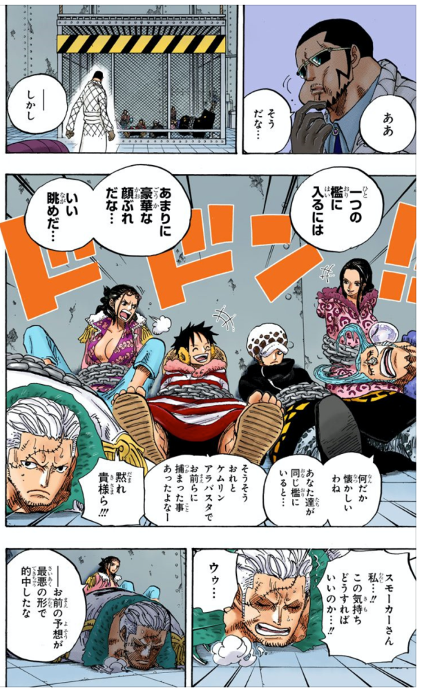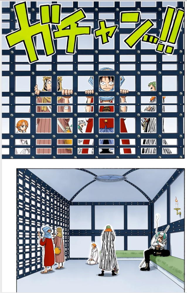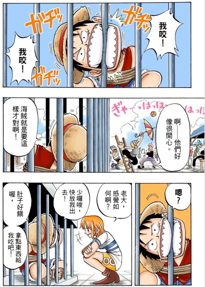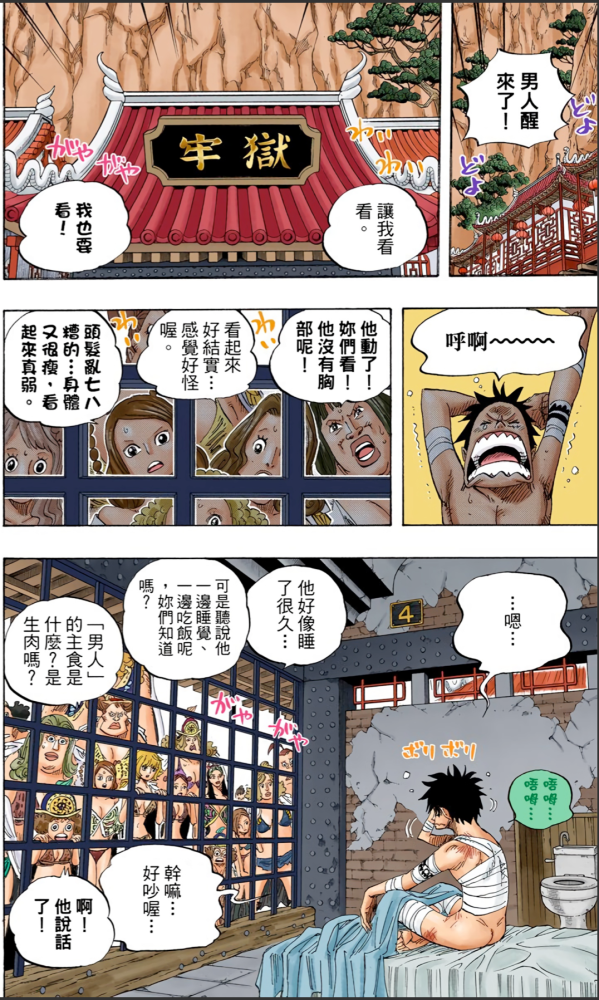 这是在路飞被拍飞到九蛇后,在林子里吃了太多毒蘑菇而晕倒,他被九蛇海贼团的女战士给带回去后,直接关在监狱里,这一段有很多有意思的场景。