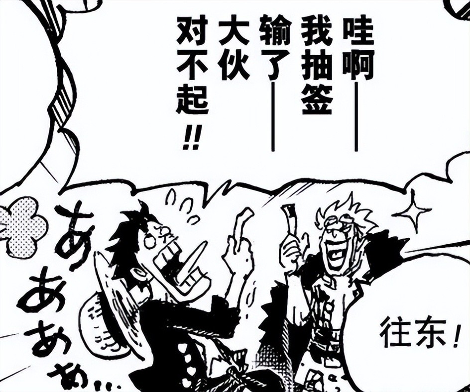 路飞输了!他的方向将是【东南】,而基德则是【正东】。你看基德笑得多开心,路飞都无语死了,甚至还向伙伴们表示对不起,可想而知他也非常喜欢前往【正东】,但很遗憾失败了。
