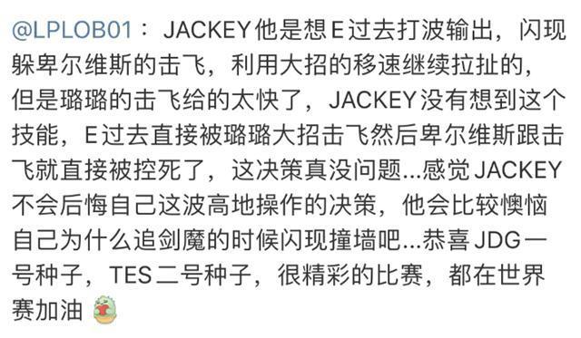 除了战队教练,LPL里面似乎也有“粉丝”。比赛结束后,有LPL的ob发文帮JackeyLove“硬洗”,其实从第一视角ob选手,可以发现他的确是失误了,并不像这位ob说的那样。