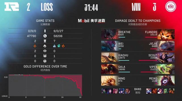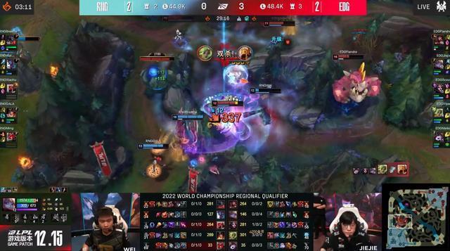 30分半,双方争夺小龙区视野,又是Scout的妖姬承担了开团任务,链子留住剑魔配合泽丽远程的W技能率先打出击杀,EDG顺势完成追击打出一波0换3的完胜,顺势一波结束了比赛,完成让2追3!成为LPL赛区的三号种子进入S12世界赛!