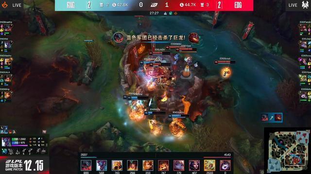 21分半小龙团,Jiejie波比大招锤走RNG野辅,帮助EDG顺利收下听牌火龙。两边的阵容确实决定了确实是比较难打得起团战,EDG双C相当灵活,还有波比保排,RNG这边的先手也不够硬,没有泰坦蔚这样的锁头机制。
