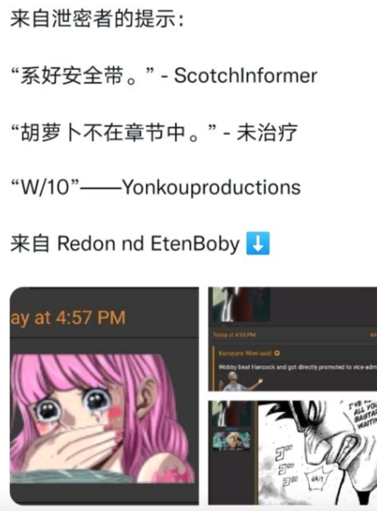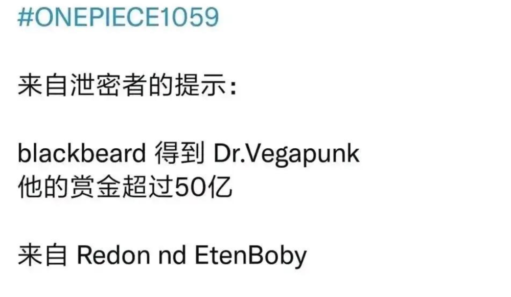 首先是情报师自己发布的暗示图,同时在字样中提到了【黑胡子、汉库克】两人的信息,加上小蜘蛛刚寻找的最新信息,基本可以确定这两位超人气角色会出现在1059话,而且还有不小的关联。