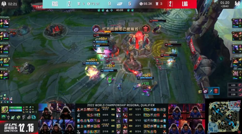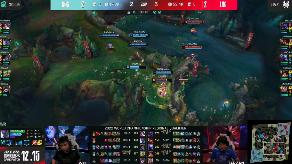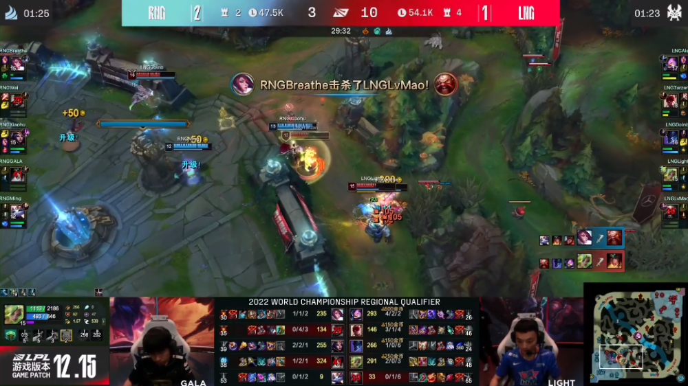 当泽丽六神装,剑姬四件套后,比赛进入到RNG环节,呼吸哥和Gala配合队友打赢水龙魂团,破掉LNG中下两路高地,并轻松拿到第二条大龙,利用大龙BUFF结束比赛,获得2022全球总决赛的门票。