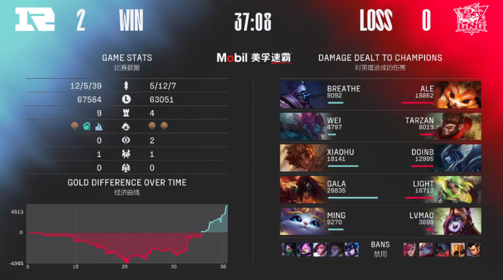 LNG也明白RNG团战获胜的关键,所以在争夺第三条听牌龙时,LNG其他人很小心,但真的是成也Ale,败也Ale。他的武器深入RNG野区被抓,导致LNG小龙团失败,RNG获得听牌水龙和大龙,追平经济,一波起势。
