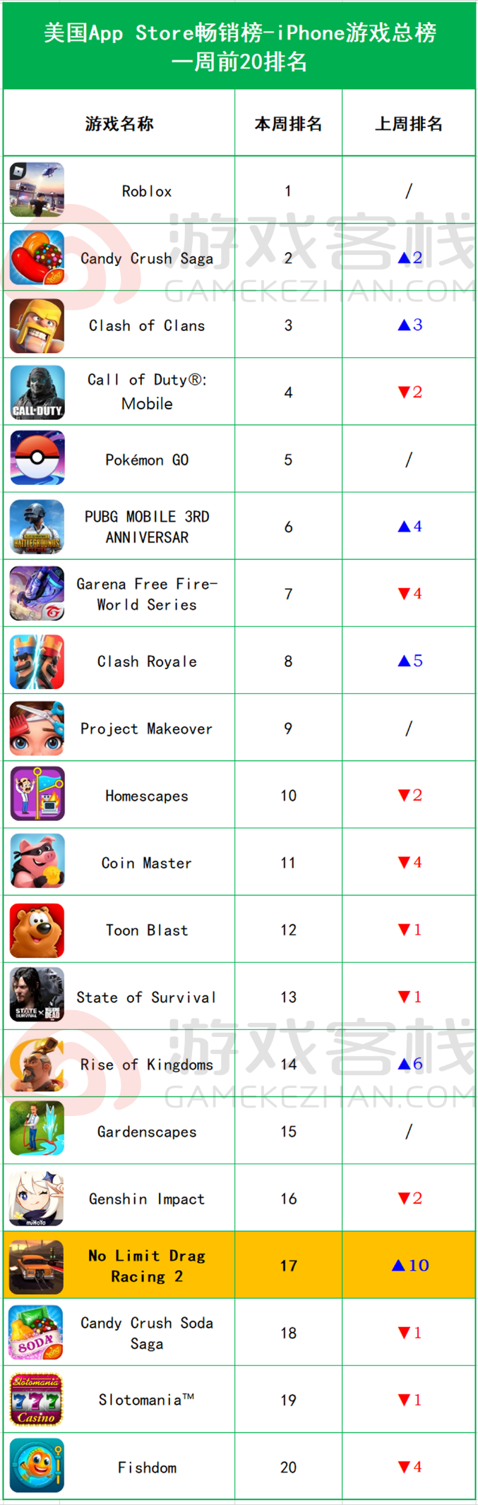 上周的iOS美国畅销榜显得比较风平浪静,排名前列的游戏变化都不是很大,只有一款《No Limit Drag Racing 2(无极限飙车2)》是新上榜的游戏。