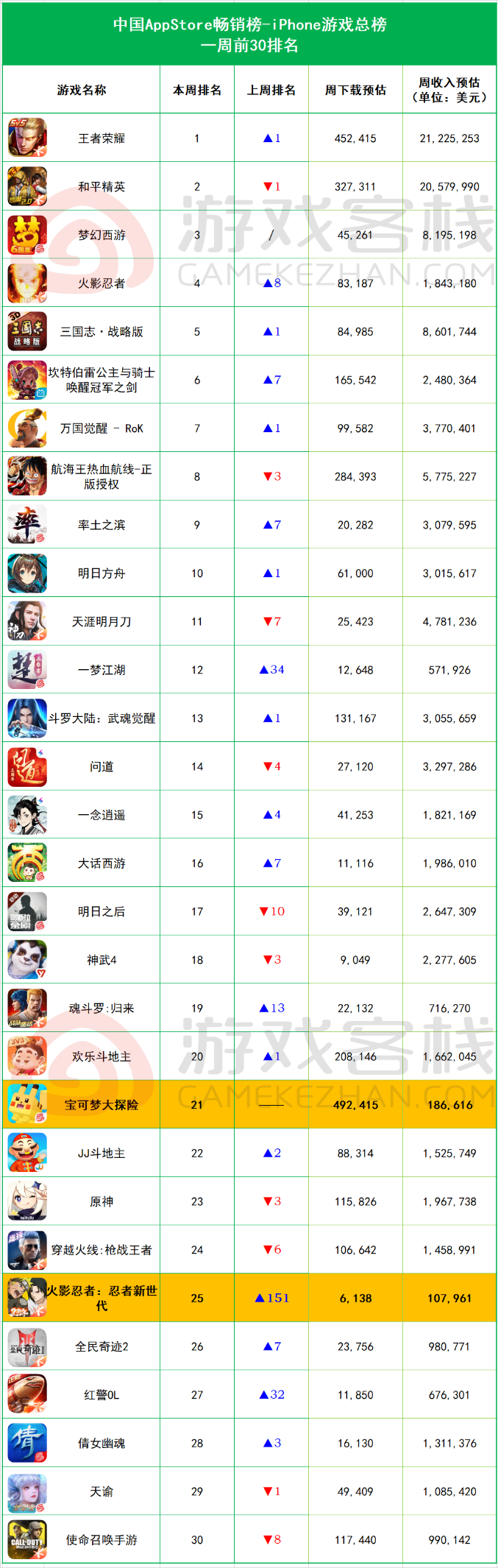 两款游戏预估周收入超过2000万美元,《宝可梦大探险》首周排名21位