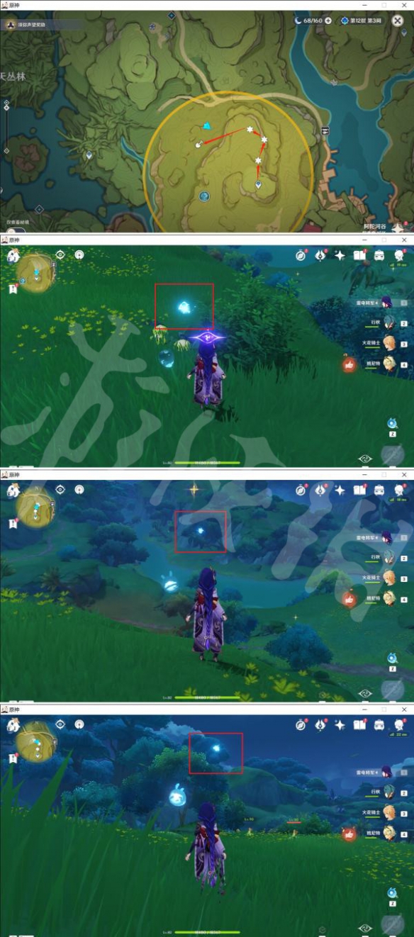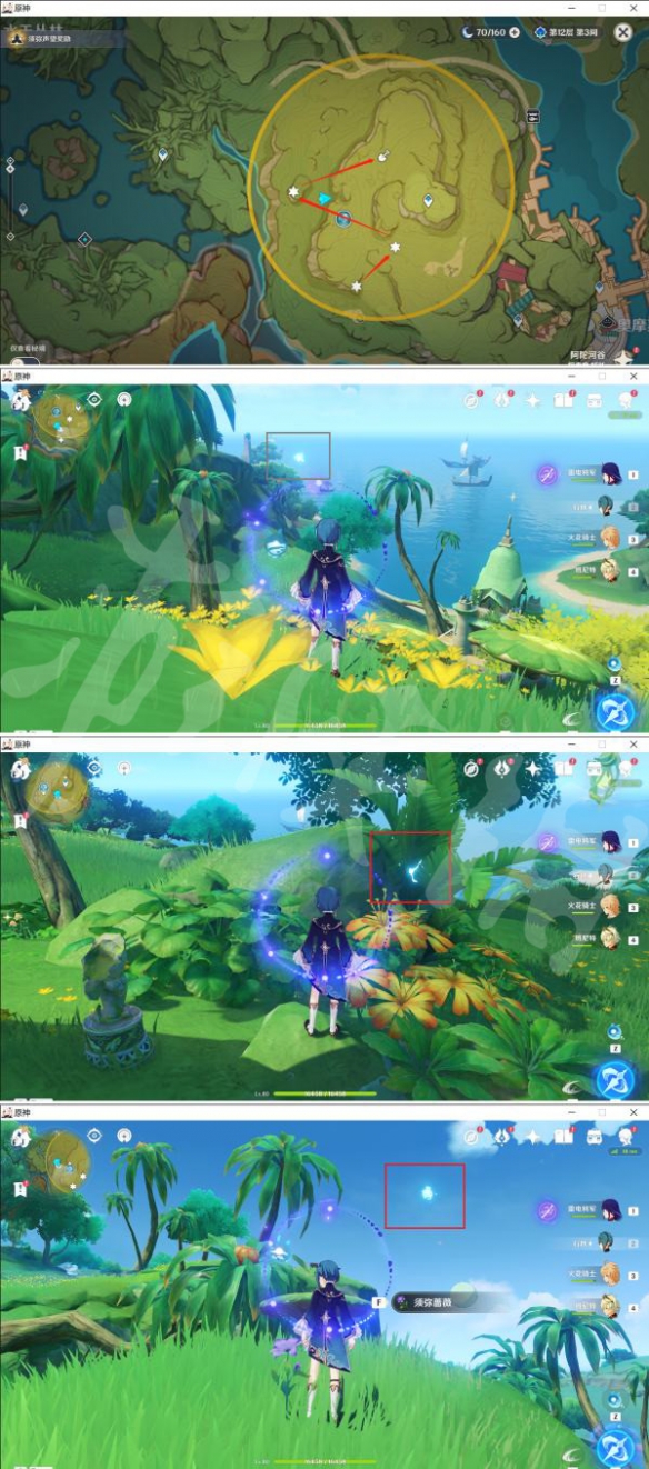 1.收集3个散落的外溢能量,图一为总览,后图已一一标出。收集完后,来到宝箱挖掘点,开启消灭怪物挑战。