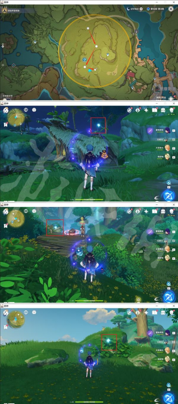 1.同样收集3个散落的外溢能量,如图下已一一标出。收集完后,来到宝箱挖掘点,开启消灭怪物挑战。