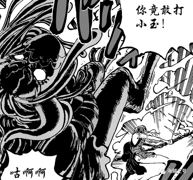 值得一提的是,大和的参战或许是尾田早就设计好的情节,当初御田和凯多的战斗中,凯多就是趁着御田被假桃之助分心的时候打倒了御田。现在,大和自称光月御田,我们也可以把她看成是凯多的“假女儿”,二十年前御田因为“假儿子”败北,二十年后,凯多也因为“假女儿” 败北,刚好呼应上了。