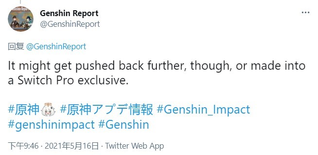 之后Genshin Report又表示,《原神》登陆Switch的时间可能会推迟,而且有可能会变成Switch Pro的独占游戏。