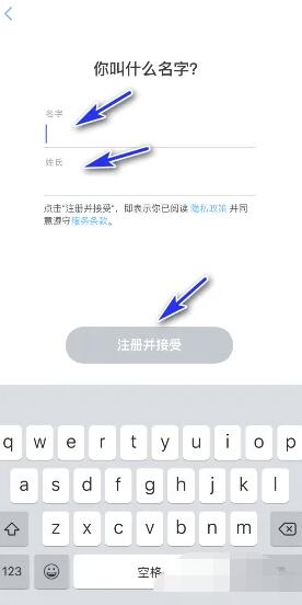 2、输入自己的名字以及姓氏,点击注册并接受。