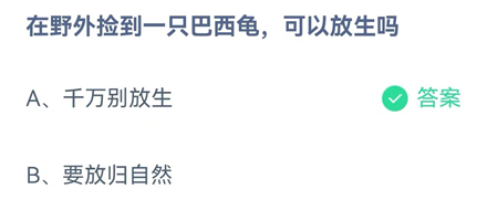 蚂蚁庄园9月7日给大家带来了问题:【在野外捡到一只巴西龟可以放生吗?】,巴西龟属于非本土生物,是不可以放生的。那么接下来小编带来了今日的答案,一起和小编来看看吧。