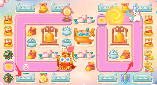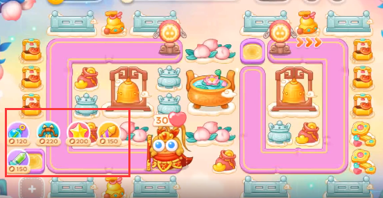 1、这一关我们可以选择的炮塔为毒针、多重箭、泡泡塔、星星、烟花,这一关我们使用多重箭输出星星防空。
