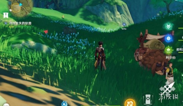 第一只驮兽沿着水潭,走到下图箭头所指位置,会看到几只丘丘人围着驮兽,处理掉丘丘人,安抚驮兽后自动回到阿尔伯身边。