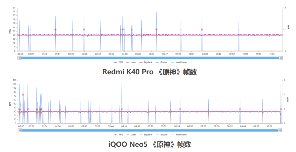 最后来到了最吃配置、也最有挑战性的硬件杀手《原神》了。我们看到在这个游戏中,红米K40 Pro与iQOO Neo5都出现了偶发卡顿的现象,足以说明这款游戏对硬件要求极高。但是如果仔细观看的话会发现红米K40 Pro的帧率曲线有细微的波动;而iQOO Neo5的细微波动更小,更趋向于一条直线,不仅没有被骁龙888拉开差距,范围要比前者更稳定一些。