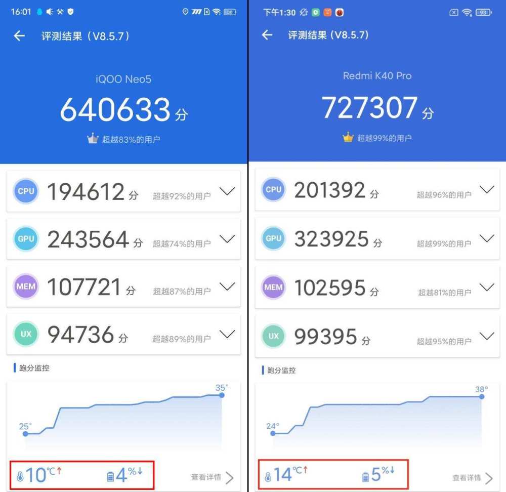 首先从绝对性能、也就是跑分成绩上来看,无疑是搭载骁龙888的红米K40 Pro更强一些,这也是情理之中的事情。我们看到红米K40 Pro的安兔兔跑分成绩达到了72万,而配备骁龙870的iQOO Neo5成绩为64万,虽然二者差距没有想象中那么大,但还是分出了高下。但跑分成绩高,就真的意味着游戏体验更出色吗?从实际体验上来看并非如此。
