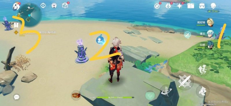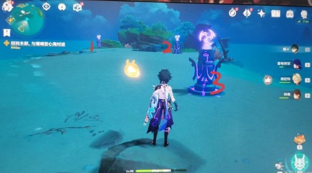 2.到达位置之后,可以看到这里有三个不同的雷元素方碑,玩家要使用雷元素来攻击点亮;