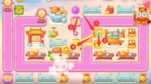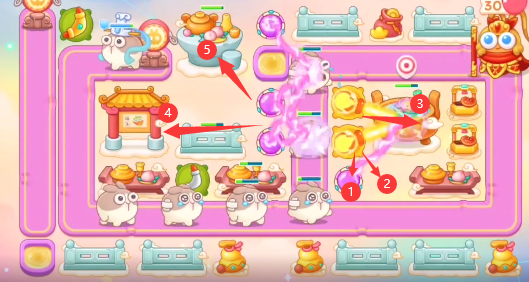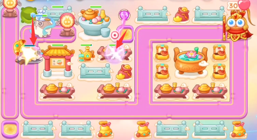 4、开完右侧之后开左侧的格子,放置刚好够清完怪的炮塔,可以留钱看看桃子在哪出来在哪边放置炮塔。