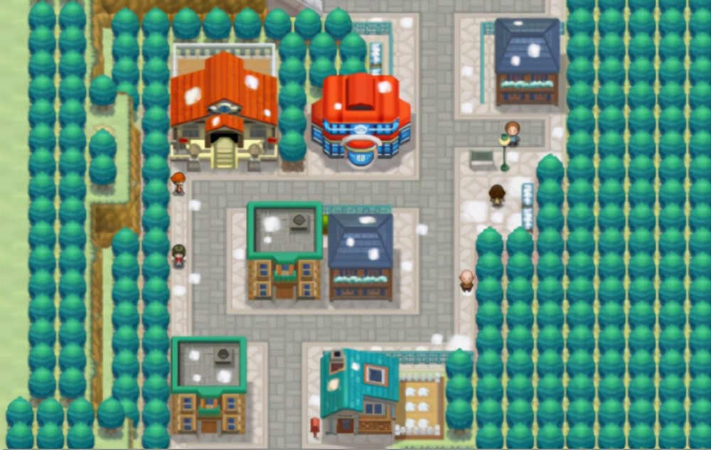 在《黑2/白2》中,冬天,桧扇市高台的楼梯右侧的建筑物前,有一块地方明明没有积雪,走上去也会有和踩在积雪上一样的脚印出来(图为游戏中冬天的桧扇市)。